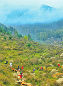 ①10月5日,浑源县莲花山景区,云雾自山谷奔涌,漫山渐染秋韵,吸引不少游客徒步游玩。本报记者刘通 本报通讯员张占兵摄