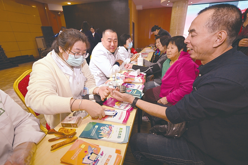 10月24日,太原市双塔北路社区举办迎重阳活动。社区卫生服务站医护人员义务为老人测量血压、血糖,守护老人健康。