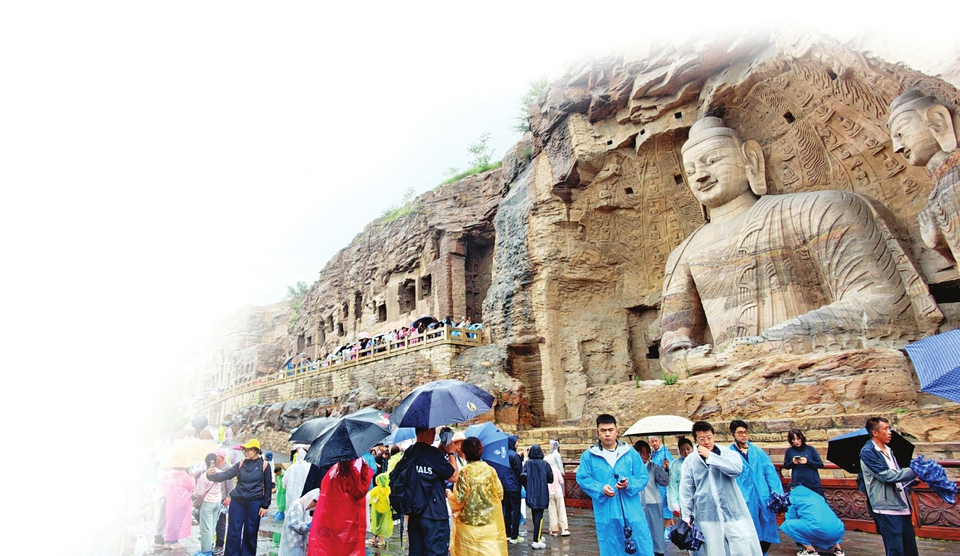大同市云冈石窟景区内,游客们踏雨游览,观赏世界文化遗产之美。金玉敏摄