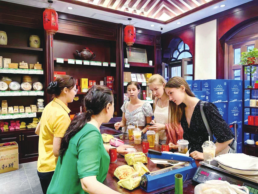 外国游客在乾和祥茶庄类博物馆店内购买茶叶。