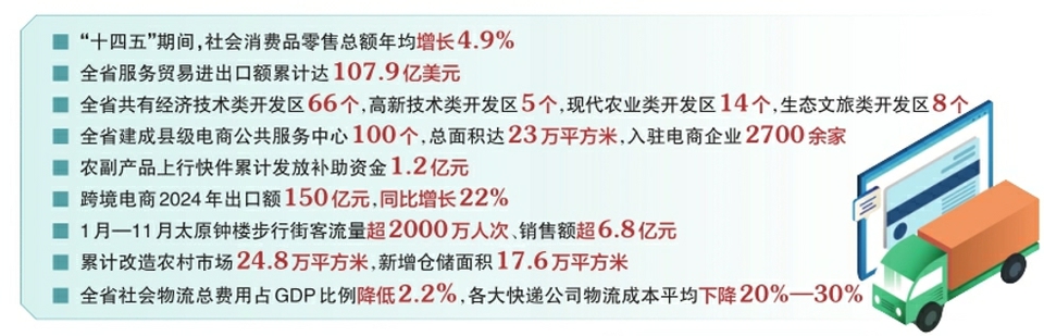 数字显示,“十四五”期间,社会消费品零售总额年均增长4.9%,建成100个乡村e镇,打造了大同黄花等113个区域公用品牌。农产品上行快件补助带动约33亿元农产品销售。实物商品网上零售额年均增长24.1%,高于全国17.1个百分点。