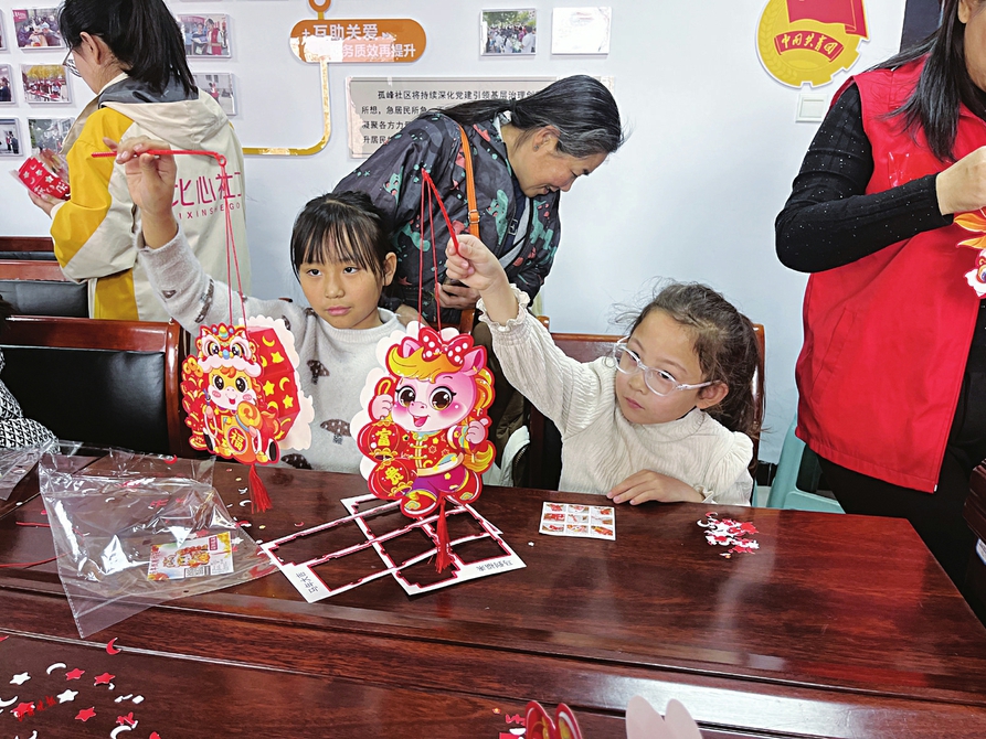 3.万荣县孤峰社区的孩子们制作马年手工灯笼。