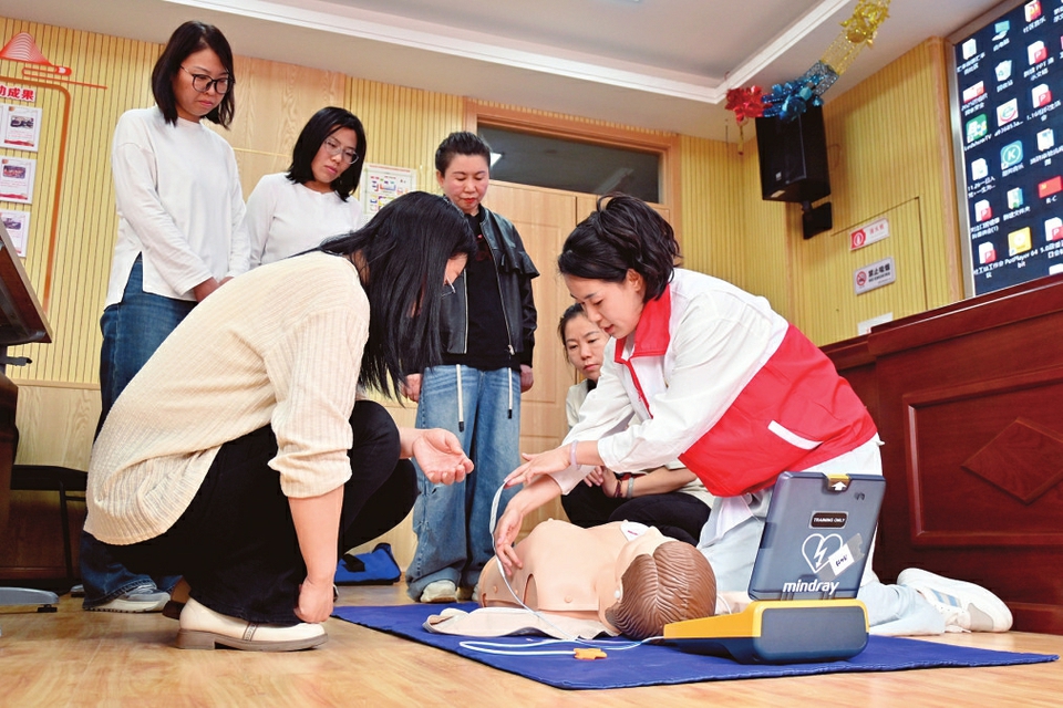 太原市万柏林区小井峪街道蓝山社区联合该区红十字会开展救护员培训,吸引辖区居民、工作人员及志愿者积极参与。本报记者范文静摄