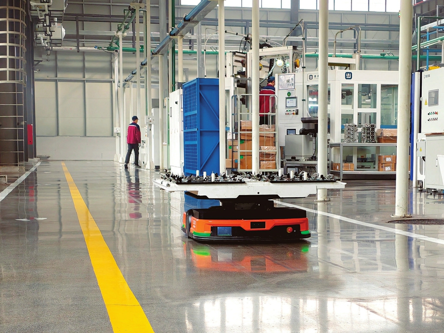 机加车间内,AGV无人车穿梭运送物料。