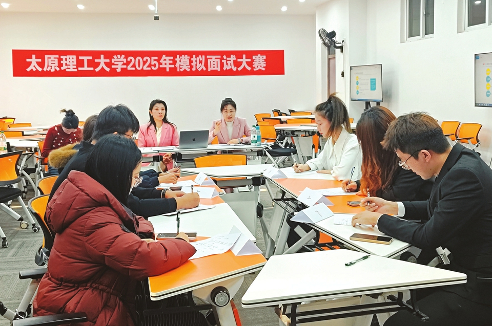 太原理工大学2025年举办了首届“学生职业发展与就业能力提升月”活动,图为在模拟面试大赛现场,学生们正真切体验面试情景。