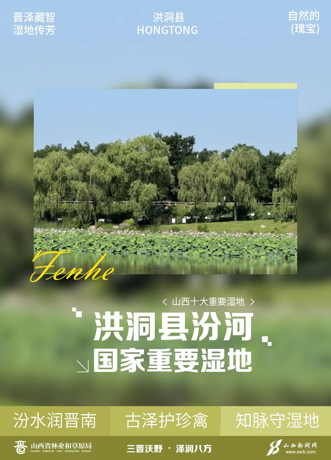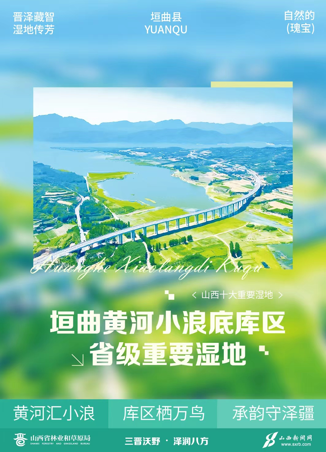 三晋沃野,泽润八方,湿地是自然的瑰宝,更是传统生态智慧的载体。山西十大重要湿地,融山水之秀,承古邑之智,以千年传承的生态理念守护一方碧水,让珍禽栖芳洲、灵草生泽畔,在表里山河间绘就湿地与传统知识共生共荣的晋地画卷。